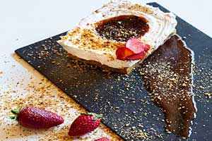 biscuit base with fresh cheese cream and srawberry sauce 5,5€