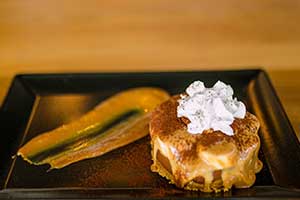 biscuit base, chocolate ganache, fresh banana, toffee and whipped cream 5,5€