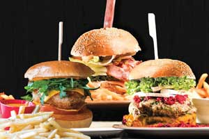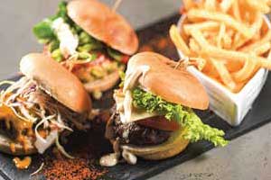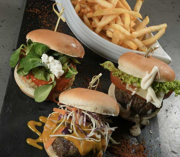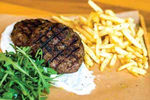 μοσχαρίσια μπιφτέκια, τηγανιτές πατάτες, sauce με γιαούρτιbeef mince burger, sauce with yogurt, fried potatoes