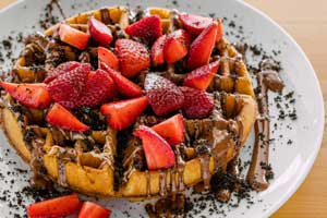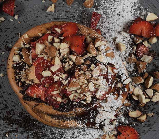 Syrup Chocolate, Hazelnut, Strawberry, Banana, Sour Cherry, Caramel, Crushed biscuit.