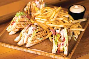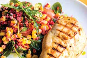Φρέσκο φιλέτο κοόπουλο στήθος κοτόπουλο με πράσινη σαλάτα, καλαμπόκι, μπέικον, λαδολέμονο και σουσάμιFresh chicken filet with green salad, corn, bacon, oil and lemon sauce and sesame